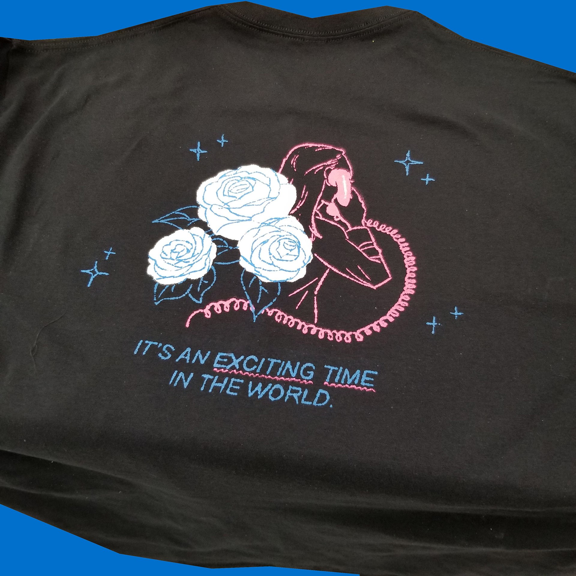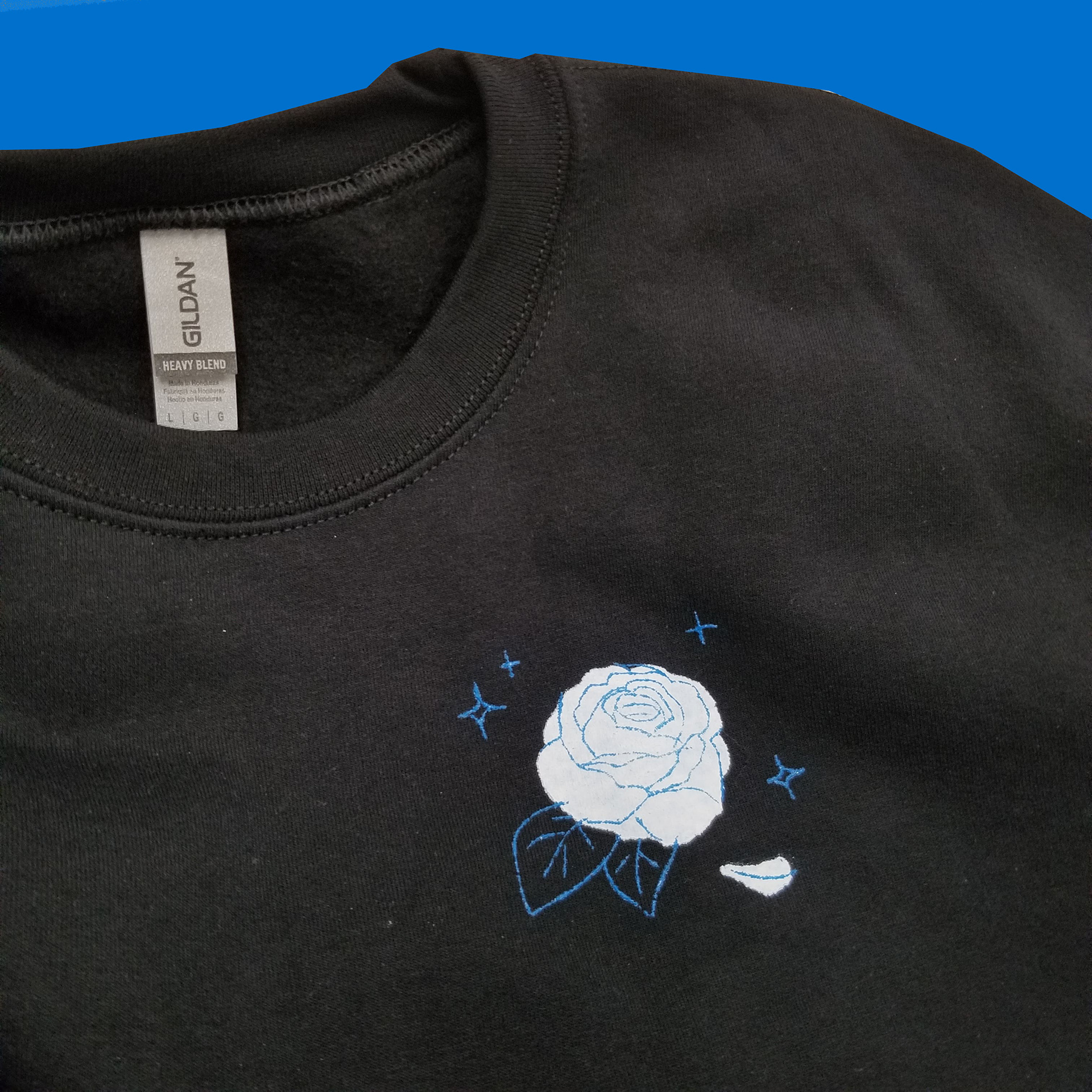 3-color sweatshirt design (front and back), silkscreen printed by hand.