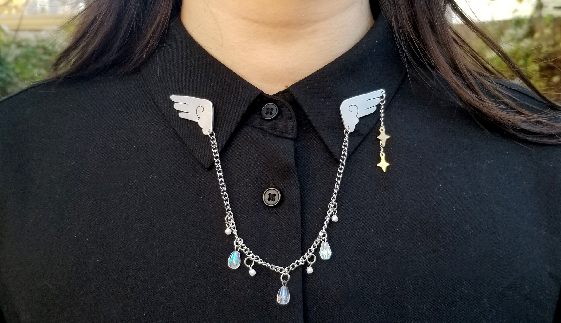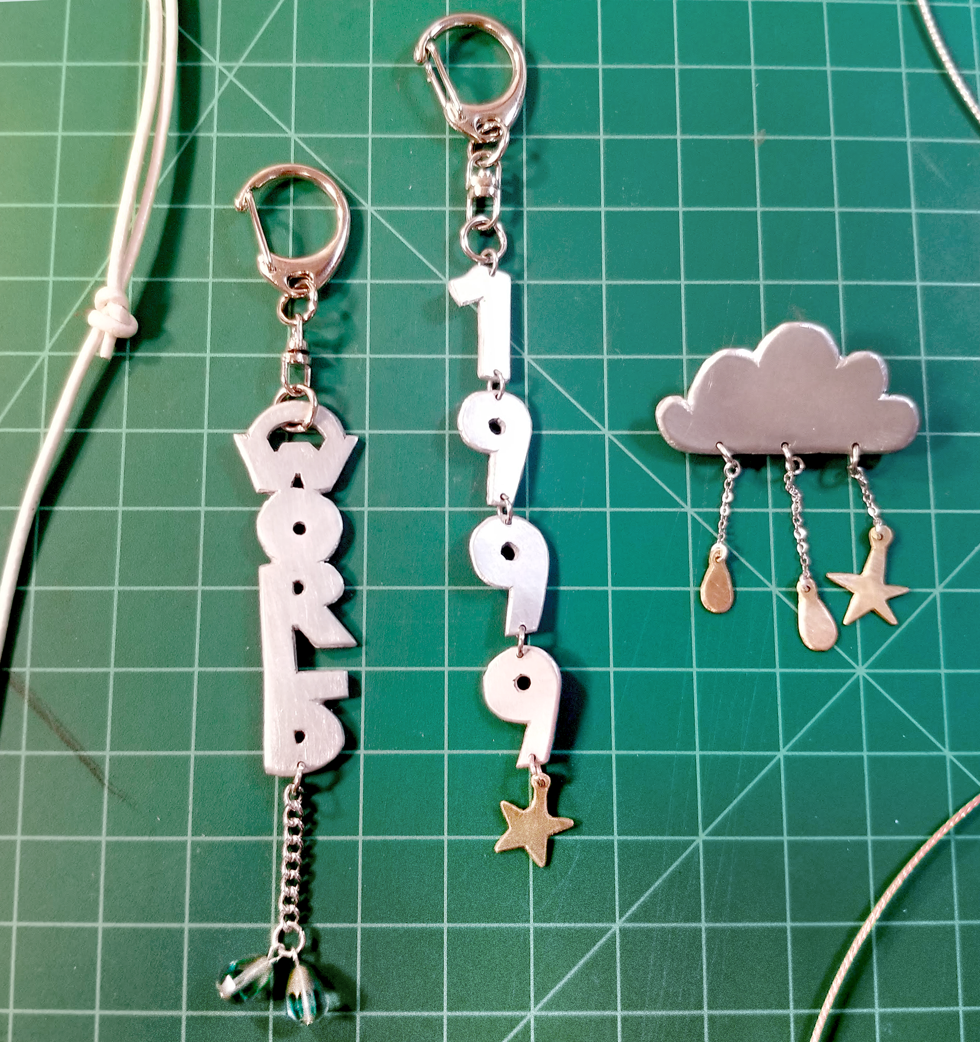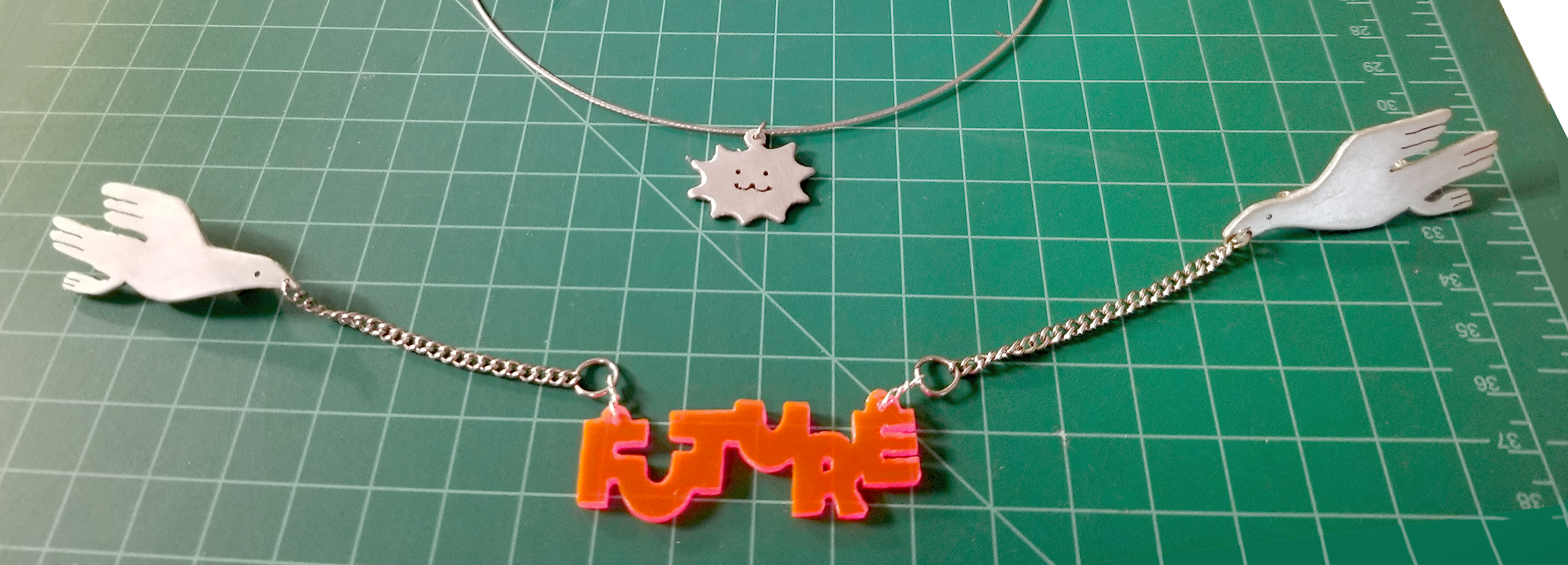 selected necklaces, pins, and keychains. made from hand-cut aluminum, brass, + acrylic, beachcombed objects, & glass beads.