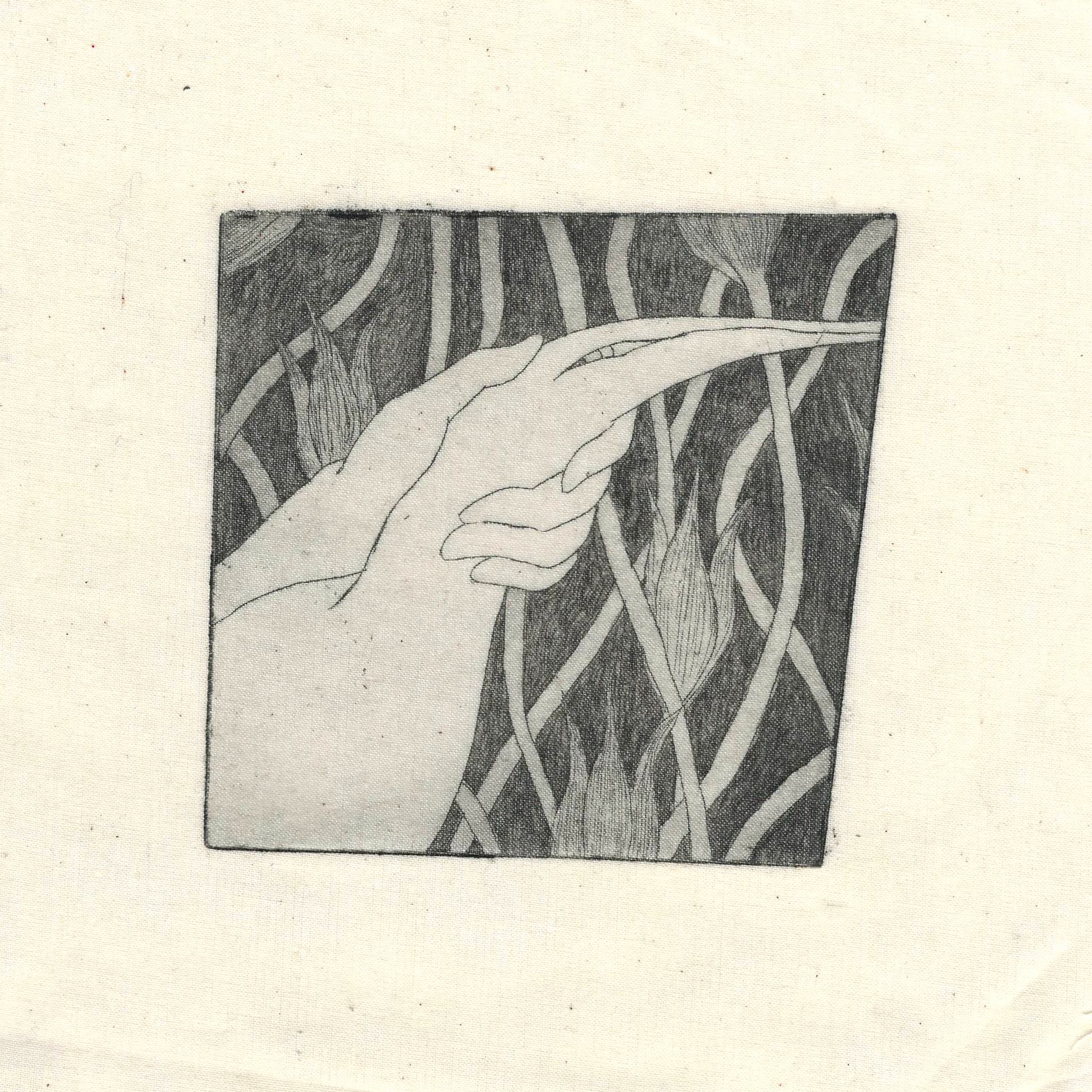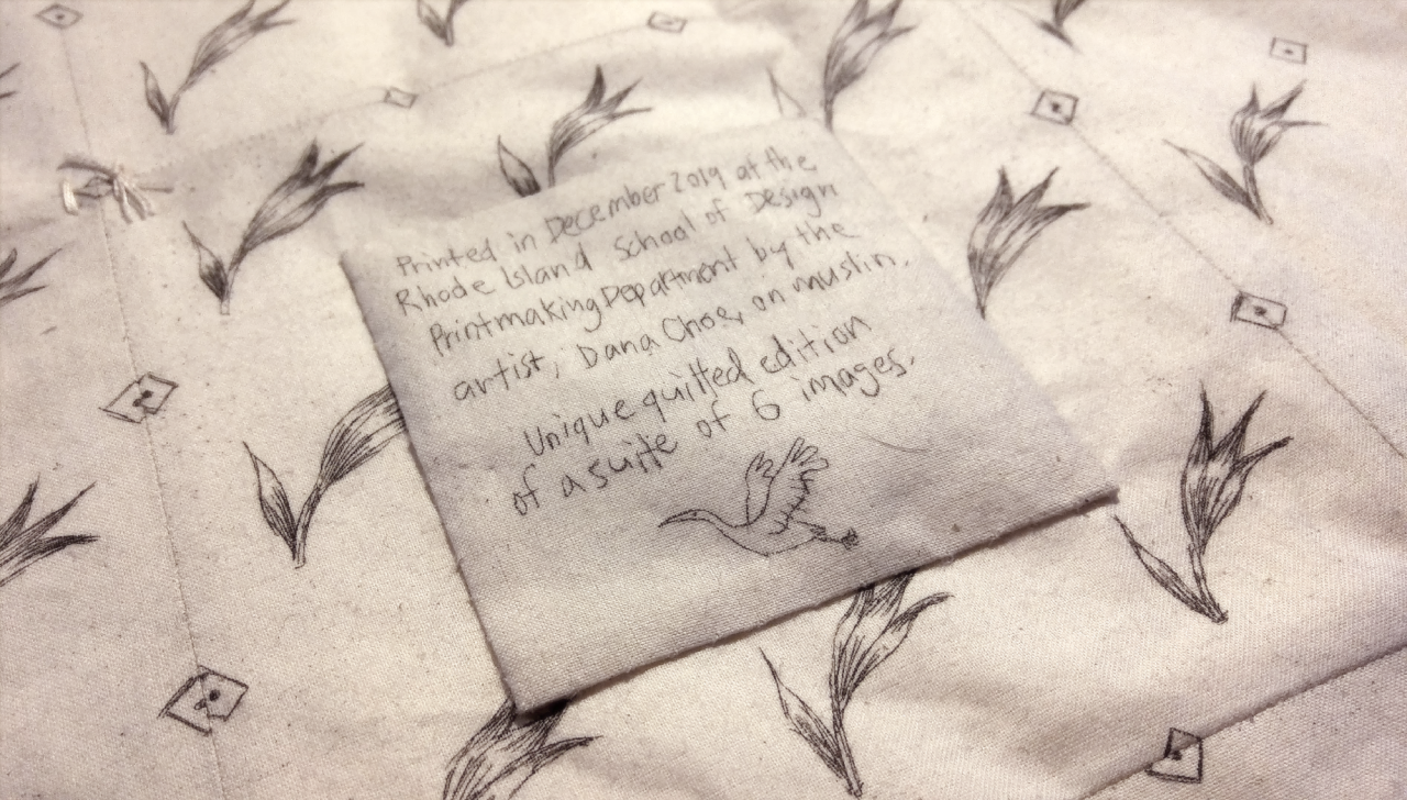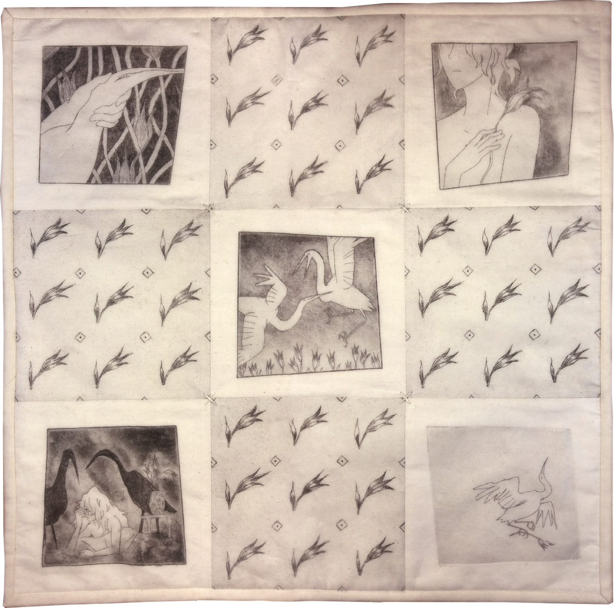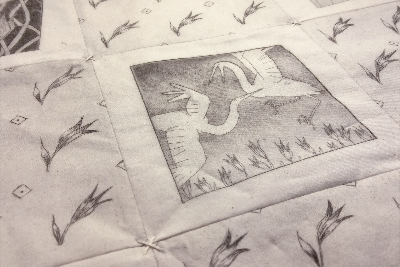 Handmade quilt on the theme of romance. Etching and rosin aquatint on muslin, 2019.