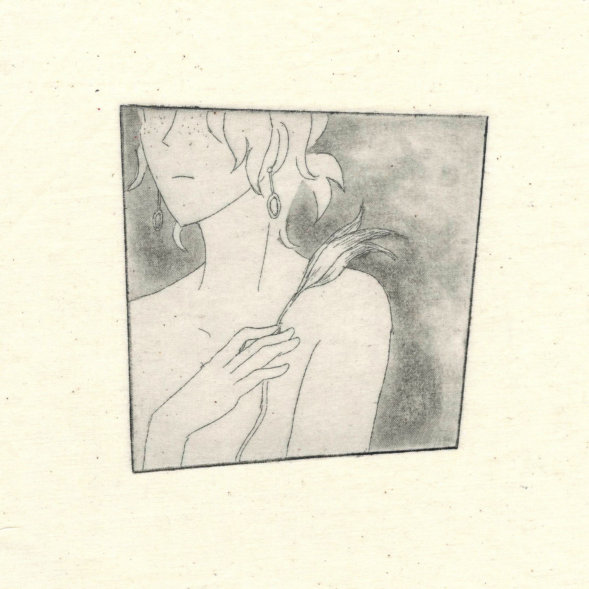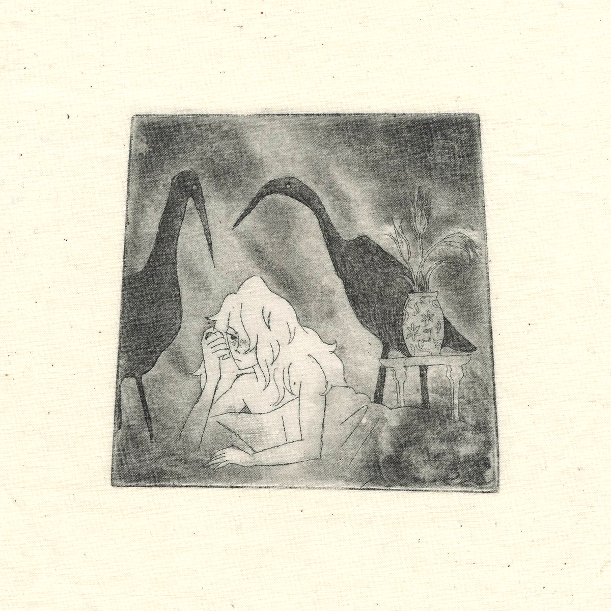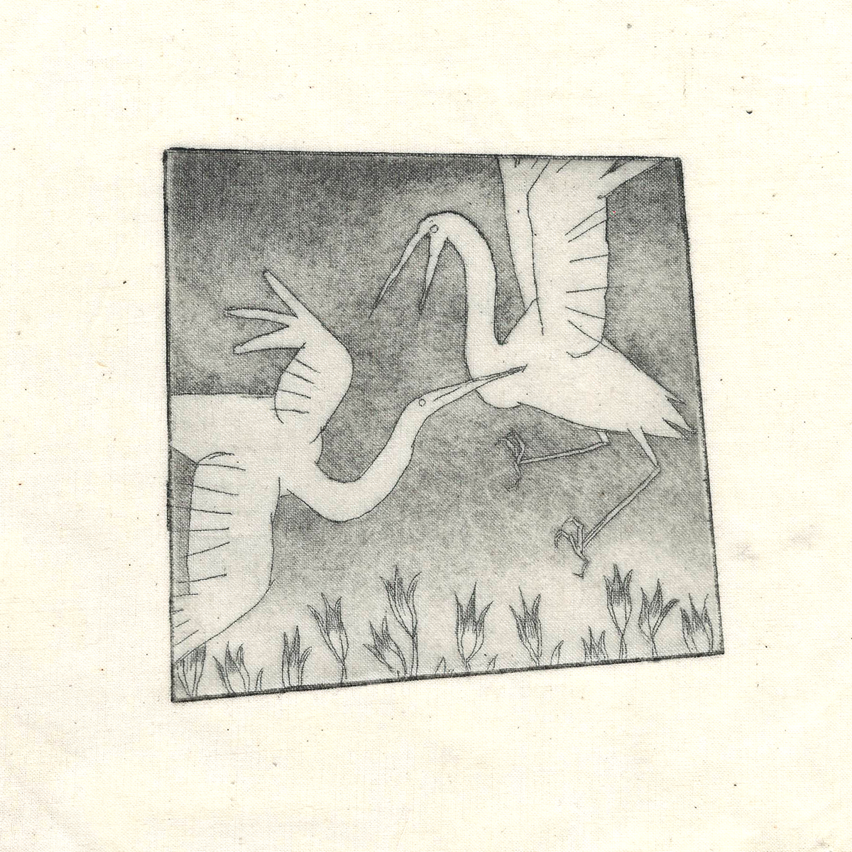 Handmade quilt on the theme of romance. Etching and rosin aquatint on muslin, 2019.